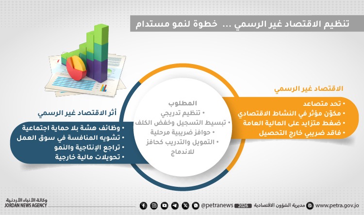 وأكد خبراء اقتصاديون لوكالة الأنباء الأردنية ( بترا)، أن الاقتصاد غير الرسمي لم يعد ظاهرة هامشية، بل غدا مكونا مؤثرا في النشاط الاقتصادي، يقيد القدرة على تحقيق نمو شامل، ويضعف تحقيق العدالة الضريبية، الأمر الذي يجعل استمرار توسع الاقتصاد غير الرسمي له انعكاس سلبي على الإيرادات الحكومية، وجودة فرص العمل، ومستويات الحماية الاجتماعية، فضلا عن تأثيره على المنافسة بين المنشآت والإنتاجية الكلية.