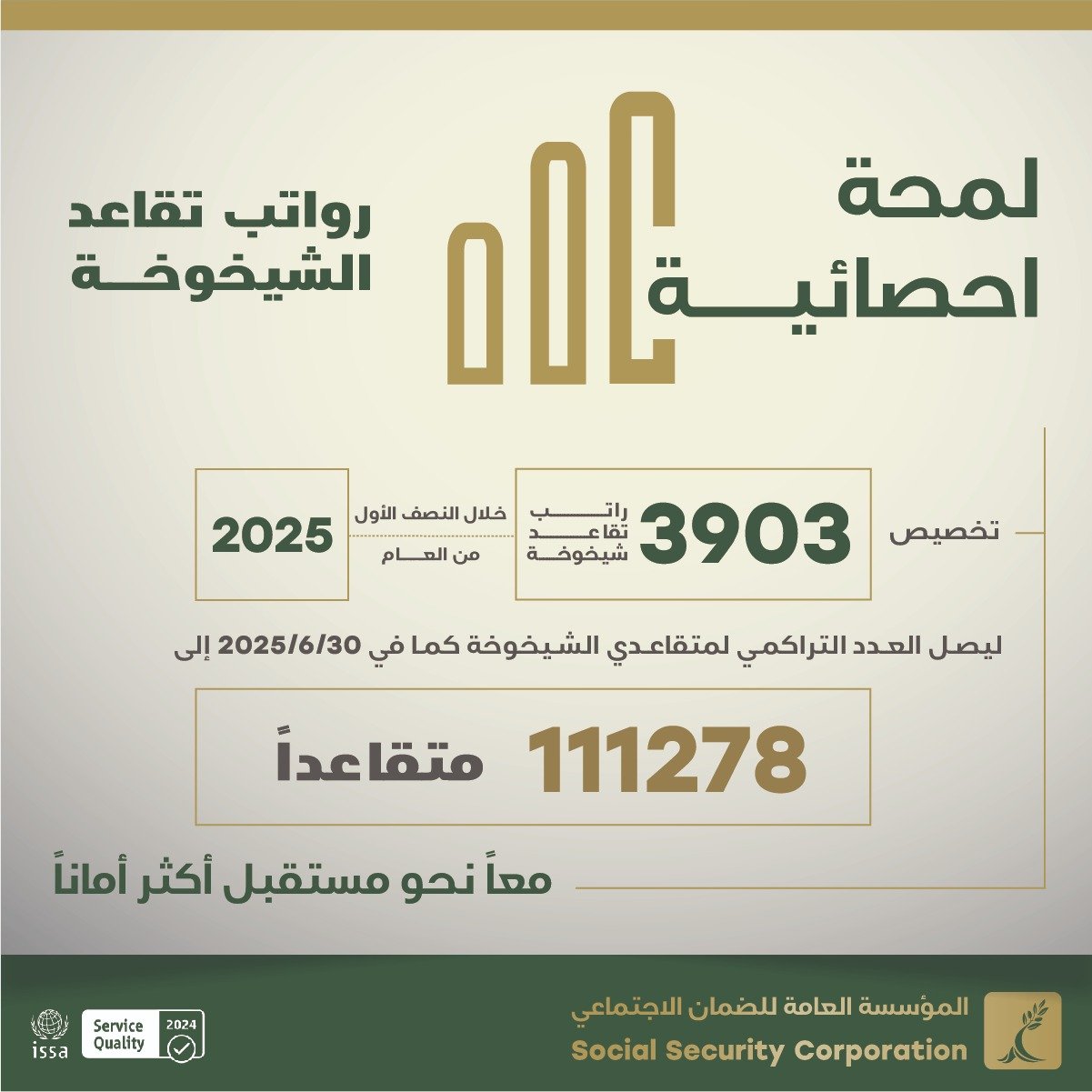 اسواق جو –  أعلنت المؤسسة العامة للضمان الاجتماعي عن تخصيص 3903 رواتب تقاعد شيخوخة خلال النصف الأول من العام الحالي 2025، ليصل العدد التراكمي لمتقاعدي الشيخوخة إلى نحو 111 ألفا و278 متقاعدا.