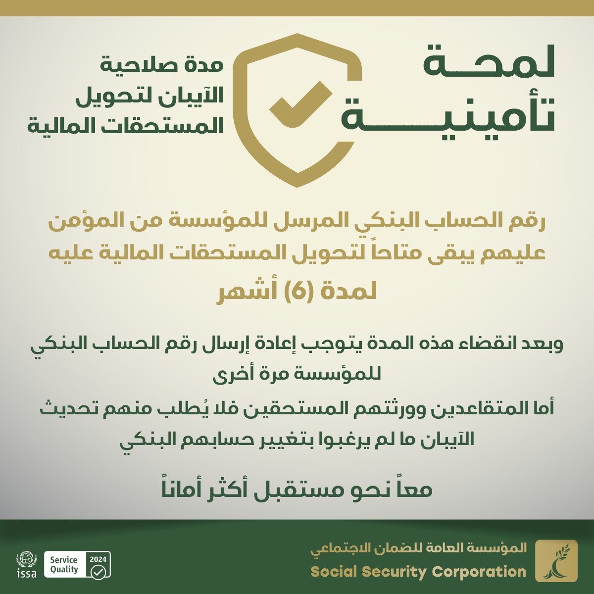 اسواق جو – دعت المؤسسة العامة للضمان الاجتماعي جمهورها من غير المتقاعدين إلى تحديث أرقام حساباتهم البنكية “الآيبان” التي مضى على تزويدها بها أكثر من ستة شهور في حال التقدم لأي منفعة تأمينية لغايات تحويل مستحقاتهم المالية عليها.