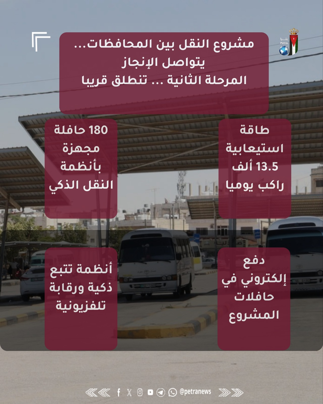 ويأتي هذا المشروع ضمن جهود وزارة النقل لتطوير منظومة نقل عام حديثة ومنتظمة بين المحافظات، بما يسهم في تحسين مستوى الخدمة المقدمة للمواطنين، ودعم التنمية الاقتصادية في مختلف مناطق المملكة، وتعزيز كفاءة الربط بين المدن، وتحريك النشاط الاقتصادي بربط أسواق العمل في مختلف المناطق.