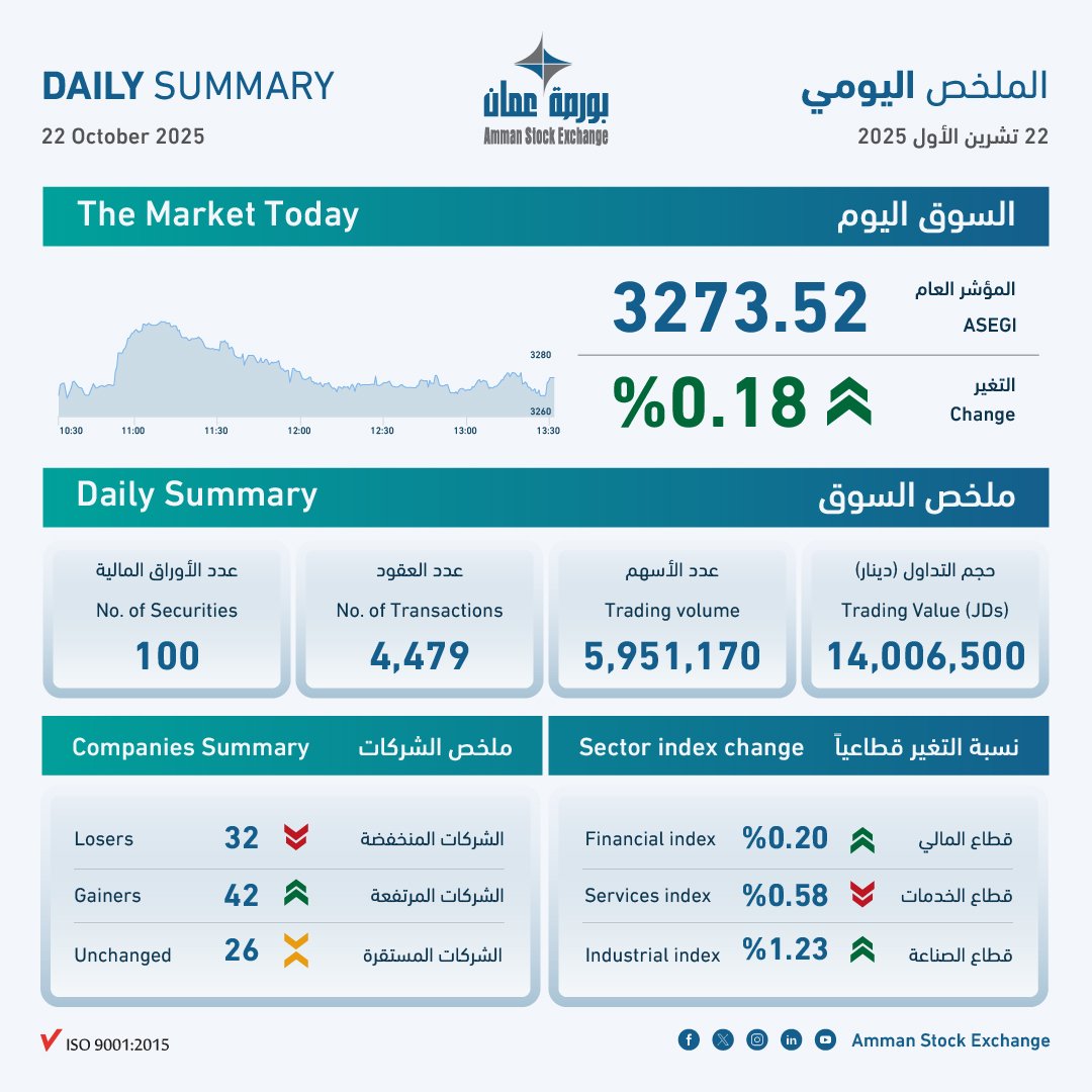 وارتفع الرقم القياسي العام لأسعار الأسهم لإغلاق هذا اليوم إلى 3273 نقطة، بارتفاع نسبته 0.18 بالمئة، إذ ارتفع الرقم القياسي في قطاع الصناعة بنسبة 1.23 بالمئة، وفي القطاع المالي بنسبة 0.20 بالمئة، بينما انخفض الرقم القياسي في قطاع الخدمات بنسبة 0.58 بالمئة.