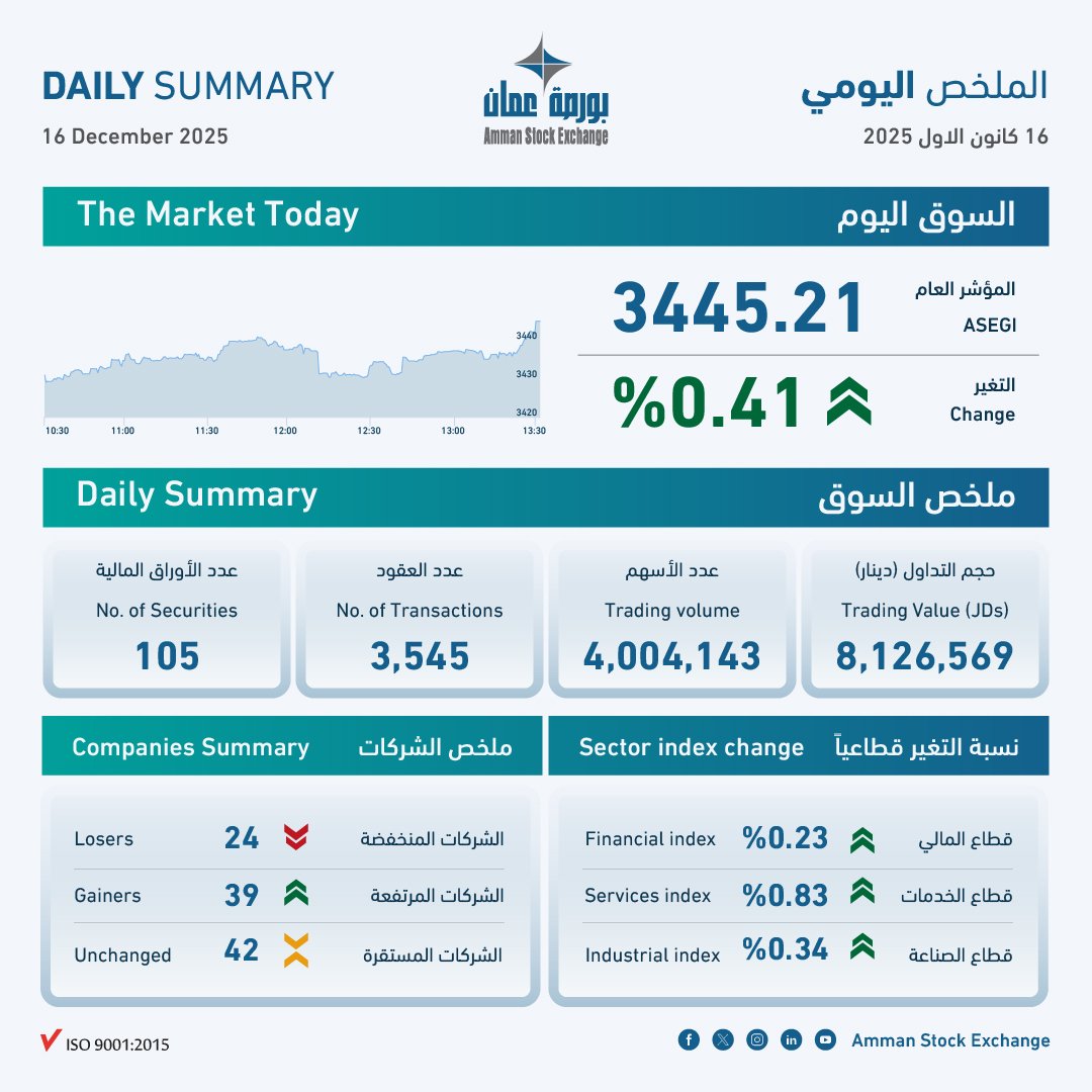 وارتفع الرقم القياسي العام لأسعار الأسهم لإغلاق هذا اليوم إلى 3445 نقطة، بارتفاع نسبته 0.41 بالمئة، إذ ارتفع الرقم القياسي في قطاع الخدمات بنسبة 0.83 بالمئة، وفي قطاع الصناعة بنسبة 0.34 بالمئة، وفي القطاع المالي بنسبة 0.23 بالمئة.