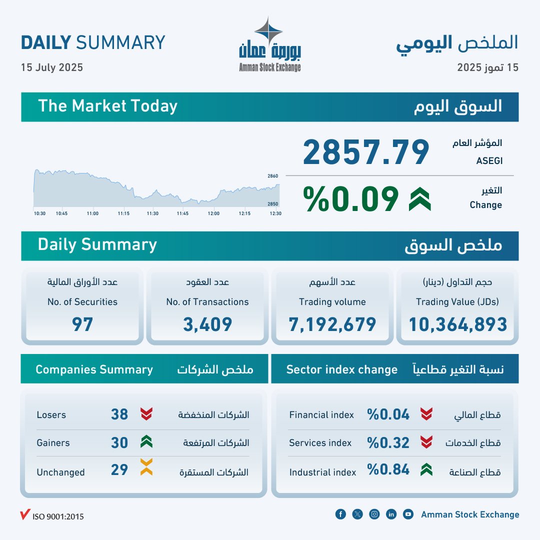 اسواق جو – اغلقت بورصة عمان تداولاتها اليوم الثلاثاء على ارتفاع نسبته 0.09 بالمئة الى مستوى النقطة 2857، حيث بلغت الأسهم المتداولة 7.1 مليون سهم، بقيمة 10.3 مليون دينار، نتيجة عقد 3409 صفقات.