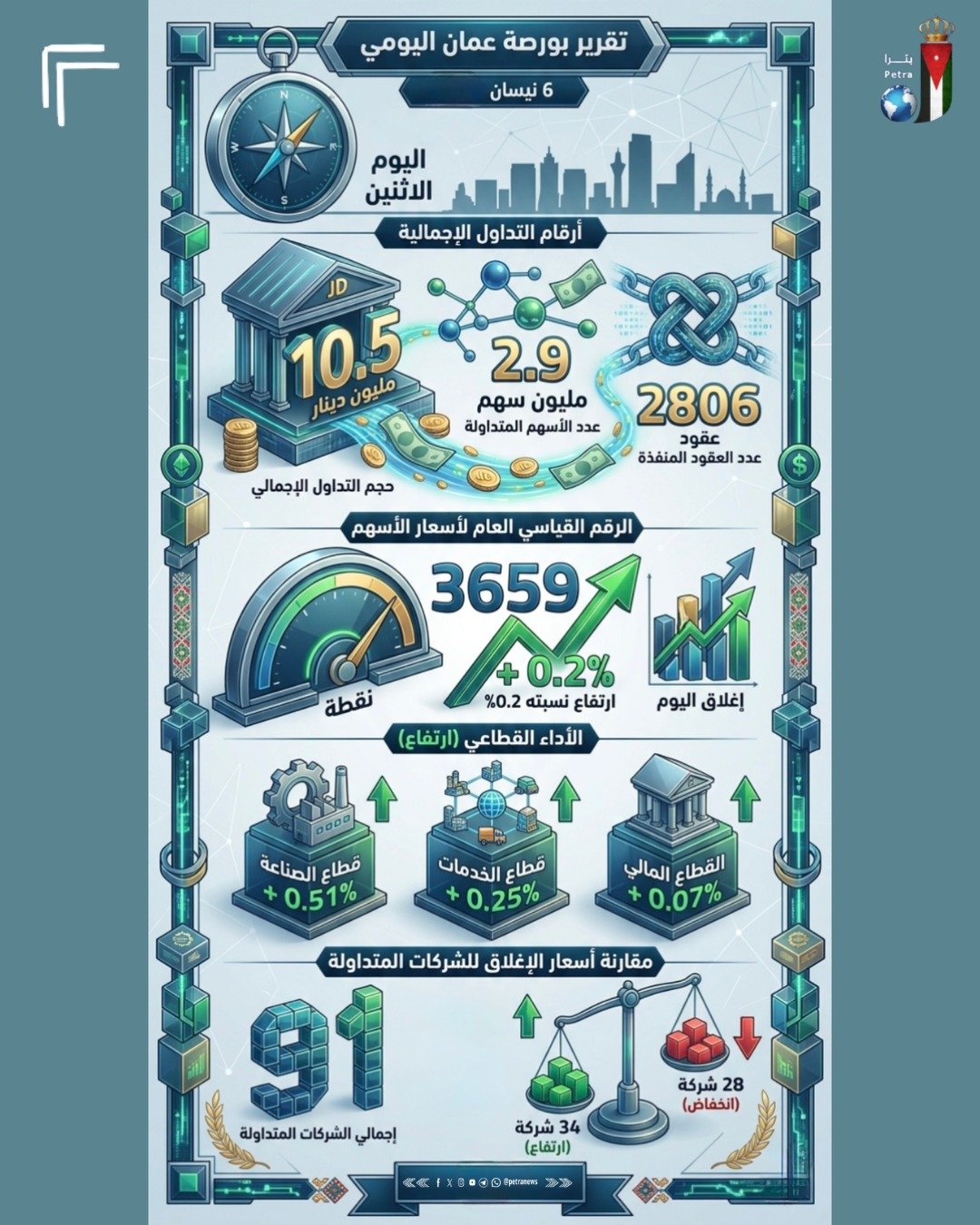 وارتفع الرقم القياسي العام لأسعار الأسهم لإغلاق هذا اليوم إلى 3659 نقطة، بارتفاع نسبته 0.2 بالمئة، إذ ارتفع الرقم القياسي في قطاع الصناعة بنسبة 0.51 بالمئة، وفي قطاع الخدمات بنسبة 0.25 بالمئة، وفي القطاع المالي بنسبة 0.07 بالمئة.
