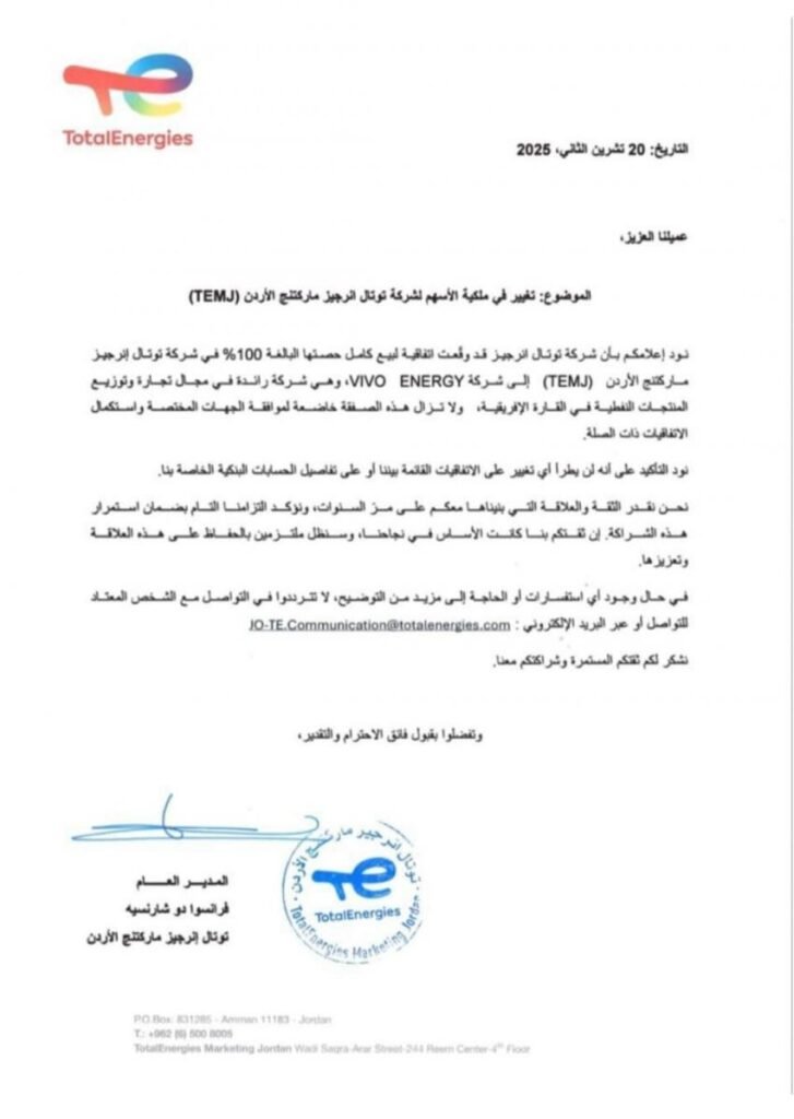 اسواق جو – أعلنت شركة توتال انرجيز، بيع كامل حصتها البالغة 100% في شركة توتال إنرجيز ماركتنج الأردن (TEMJ) إلى شركة VIVO ENERGY.