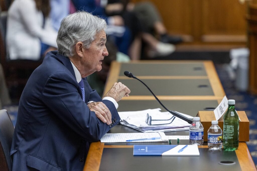 epa12195213 Chairman of the Federal Reserve Jerome Powell testifies during the House Financial Services Committee hearing on the Federal Reserve’s Semi-Annual Monetary Policy Report on Capitol Hill in Washington, DC, USA, 24 June 2025. Chairman Powell said the Federal Reserve will see how the economy evolves before deciding on a rate cut as President Trump simultaneously calls for immediate cuts. EPA/SHAWN THEW