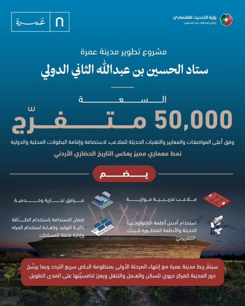 وأطلق رئيس الوزراء جعفر حسان، السبت، مشروع مدينة عمرة الذي يشكل نموذجاً جديداً في التطوير الحضري وإدارة النموّ السكاني طويل الأمد، ويراعي معايير الاستدامة والحداثة، ويفتح فرصاً استثماريَّة واقتصاديَّة واعدة، وهو نواة لمدينة مستقبليَّة نموذجيَّة للشباب والجيل القادم، وبتنظيم وتخطيط محكم، تمتد مراحل تطويرها على مدى 25 عاماً وبشكل عابر للحكومات.