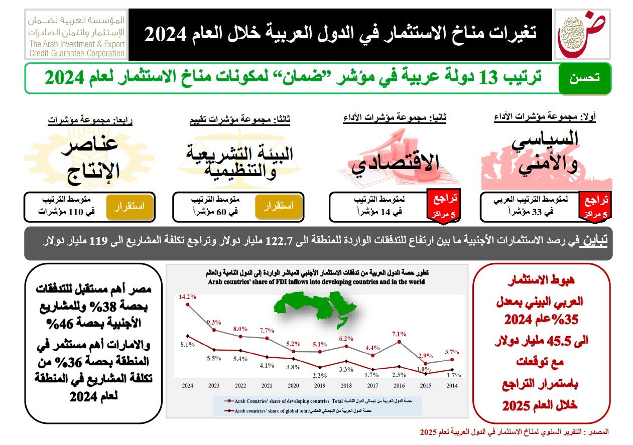 “ضمان” توصي بتنفيذ حزمة إجراءات لتحسين مناخ الاستثمار بالدول العربية