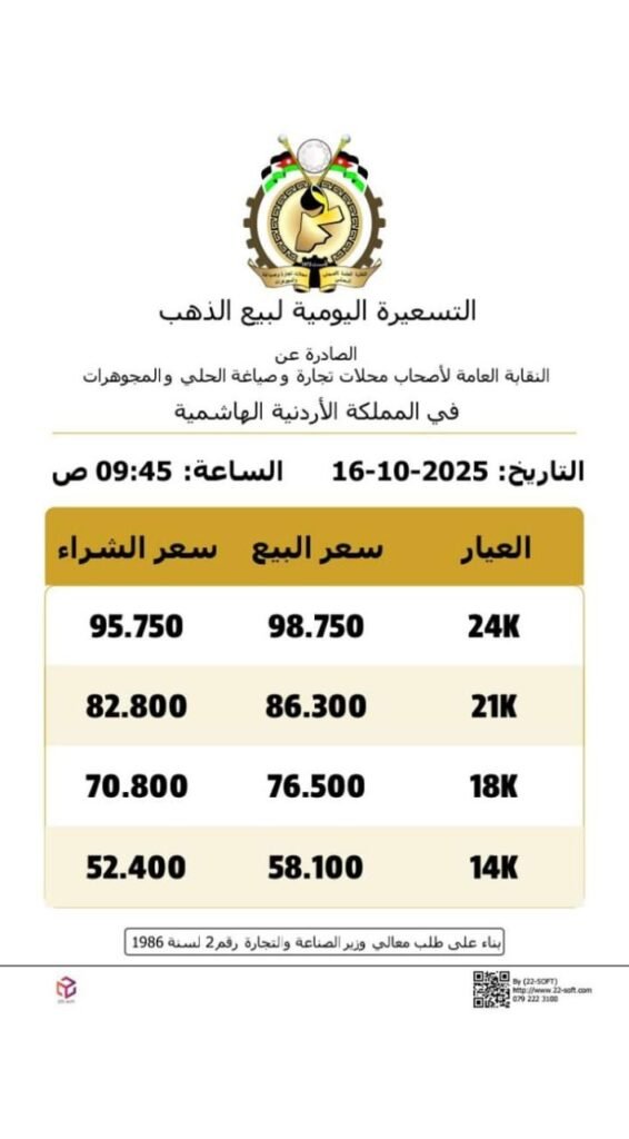 وبحسب النشرة اليومية الصادرة عن النقابة العامة لأصحاب محلات تجارة وصياغة الحلي والمجوهرات، ارتفعت أسعار غرام الذهب لعيارات 24 و18 و14 إلى 98.75 دينارًا، و76.5 دينارًا، و58.1 دينارًا على التوالي، وذلك لغايات البيع لدى محلات الصياغة.