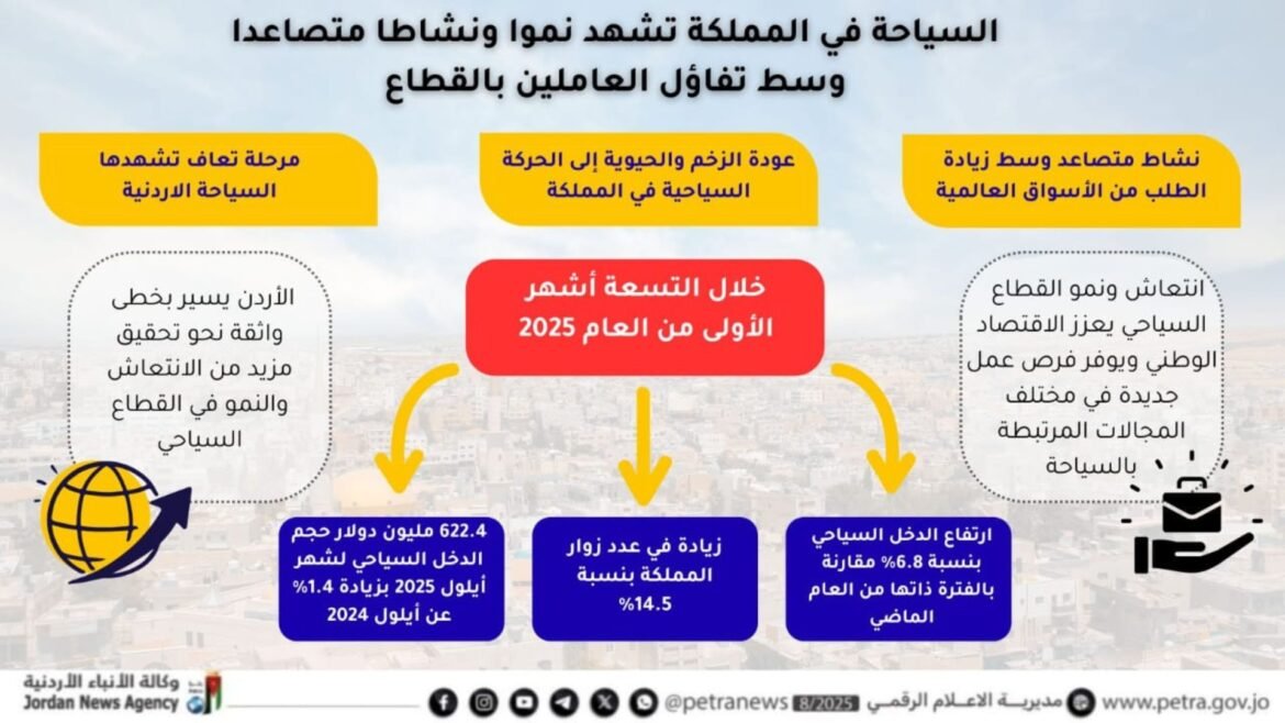 وأشار خطار، إلى أن الطلب المتزايد على المملكة يشمل الفنادق وشركات النقل السياحي والمطاعم، ما يعكس حيوية متجددة في الحركة السياحية داخل المملكة ويؤكد على قدرة القطاع على التكيف مع المتغيرات الإقليمية واستعادة جاذبيته أمام السياح الدوليين.