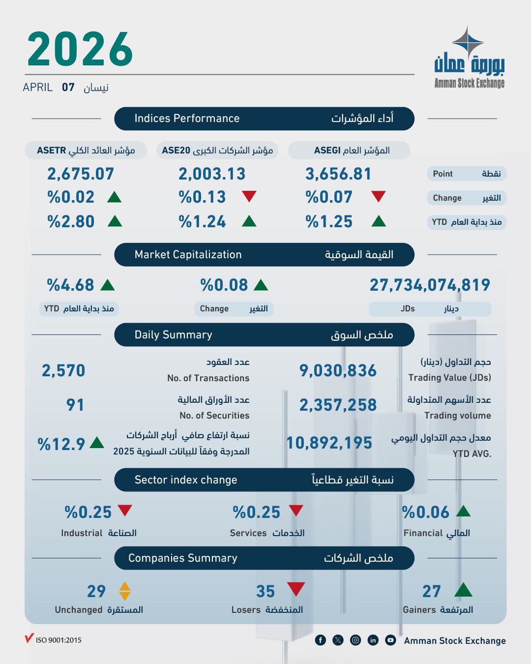 اسواق جو – بلغ حجم التداول الإجمالي في بورصة عمان، اليوم الثلاثاء، 9 ملايين دينار وعدد الأسهم المتداولة 2.4 مليون سهم، نفذت من خلال 2570 عقدا.